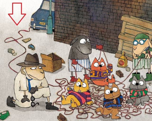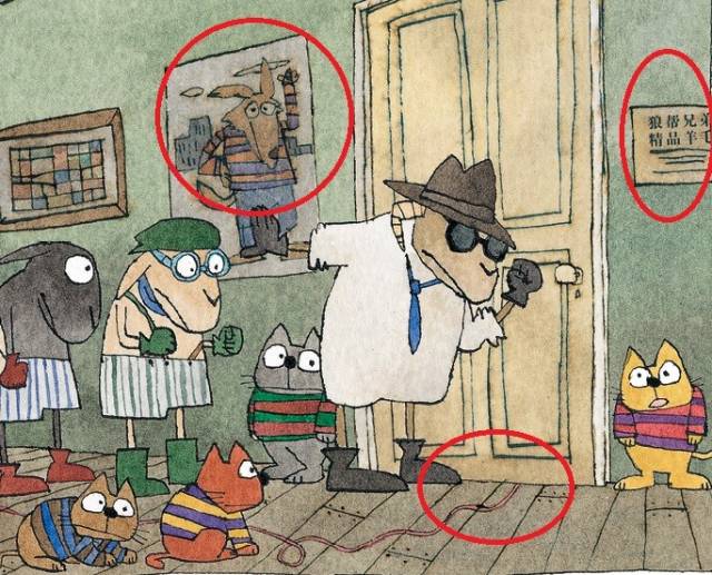 喜欢玩橄榄球的猫、爱打高尔夫球的“绅士狼”还有最重要的侦探元素——一起“悬疑”案件和酷似神探福尔摩斯的大侦探艾略特·咩!区区32页的绘本如何上演一部脑洞大开——不输好莱坞电影的“侦探大片”!? 一起匪夷所思的案件↑我喜欢风吹动我的羊毛,舒服极了→躲在草丛中的动物在计划着什么? 那是夏末的时候,我们打算去海边游最后一次泳,谁也没有料到居然会发生那件事毕竟那天的天空很蓝,一切都显得很平静 ↑我们只顾着和小鸭子一起望着天空出神了→羊羊物语:出行一定要先确保交通工具不出问题 一切的起因都源于那“咣当”一声,我们骑的车居然抛锚了! 这种高档车可是很难修的,我们只能弃车乘船前往海滩了后来我们想要是车没坏,一切也许会有所不同呢? 当我们在海边兴奋的打滚时,有四只正在玩迷你高尔夫的狼,很似友好:嘿!请为你们漂亮的外套考虑一下吧!咸咸的海水一定会泡坏它们的。 你也知道那天天气是有点热的,听起来这建议还不错可我们居然没注意到不远处的车和毛线球! ▼ 后来?我们很畅快的游完泳回来的时候发现 外套、那些友好的狼全都不见了!现场只剩下车轮印······也许下次我们该好好注意那时候狼脸上的狡猾神态! “福尔摩斯”破案纪↑大侦探艾略特正在沉思→注意到窗外的猫了吗,它可是本次案件的主角之一! 亲爱的侦探先生艾略特·咩听完我们讲诉的遭遇不慌不忙,说了声:我要出去透透气要知道,那时候街上可没什么人,他究竟在想些什么?!↑侦探艾略特对案件的嗅觉真是灵敏!→也许这些毛线是能找到偷羊外套”疑犯“的线索 哦,不得不说他可真是个大侦探! 一群猫、一团绒线 大侦探发现了一个不得了的破案线索!▼ 我们和侦探跟着毛线,顺着人行道,绕过路灯,拐过街角甚至滚过排水沟,最后进入一栋破旧的小楼里!我们兴奋极了,可不就是这里!楼梯尽头的牌子上写着:狼帮兄弟牌/精品羊毛衫 抓捕嫌疑犯:狼羊大战!↑看到左下角的毛线球了吗?→所有的线索都指向狼!一所狼开的羊毛衫店! 我们甚至能听到门里头的笑声和爵士乐!大侦探先是敲了敲门,里头声音一停,一头狼慢慢探出脑袋·····说时迟那时快,侦探一股脑儿冲进屋子,一场羊狼大战开始了!↑虽然找到了外套,可是——已经不是纯白的羊外套啦!→找到毛线的源头啦! 说实话,场面混乱的一塌糊涂,可是却有些好玩小猫们甚至玩起了投橄榄球呢!后来我们想起来,侦探先生是最为淡定的▼ 当我们走出街道时,天都快亮了我们向大家表示了感谢,猫们却说:不用谢,我们玩得很开心!确实,直到如今,回想起来都是一场玩的很开心的破案事件嘿,不过,狼们会这样想么?不过,我们现在的“狼”外套酷炫极了!领略 “喜多村惠”式不动声色的幽默,看 “侦探羊”与“绅士狼”斗智斗勇一场英伦时尚的侦探大戏!